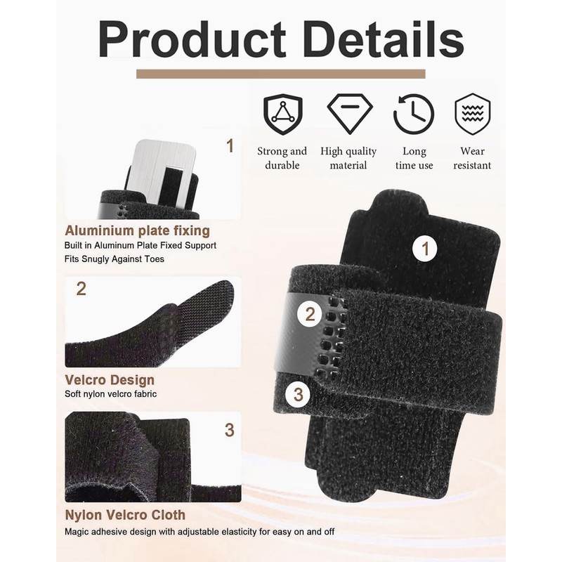 Zehenschutz: Das auffälligste Merkmal dieser Hammerzehenschiene ist das wissenschaftliche Design einer präzisionsgefertigten Aluminiumplatte, die in die Unterseite der Schiene eingebaut ist. Die weiche Stoffhülle dämpft sanft die Glättung und Ausrichtung des Hammerzehs für eine korrekte Positionierung und schützt den Hammerzeh vor Reibung