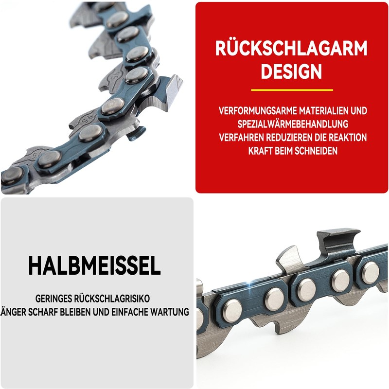• FASTER AND SMOOTH CUTTING The chainsaw chain adopts a semi-chisel design, which provides faster cutting speed and smooth and flat cutting surface, and can cut large tree trunks into small branches in seconds, saving labor, time and efficiency. This can effectively reduce the cutting resistance and extend the life of the chain.