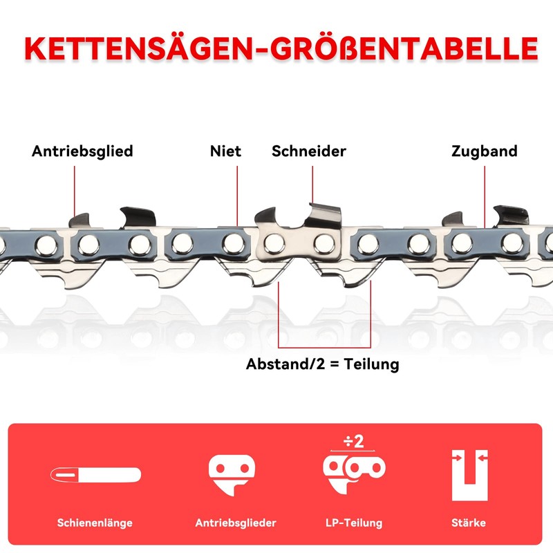 - 6-inch saw chain specifications: 3 replacement chains for the saw chain and 1 chainsaw rail. 1/4" Pitch (LP), 1.1mm Drive Link Thickness (.043"), 6" Blade Length (6"), 36 Drive Links. Note: Please check if the parameters apply to your tool before purchasing.
