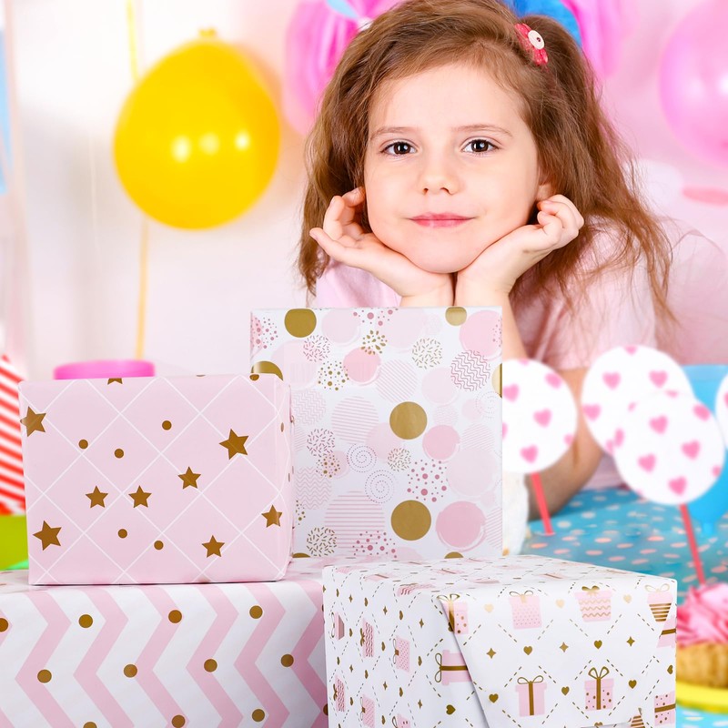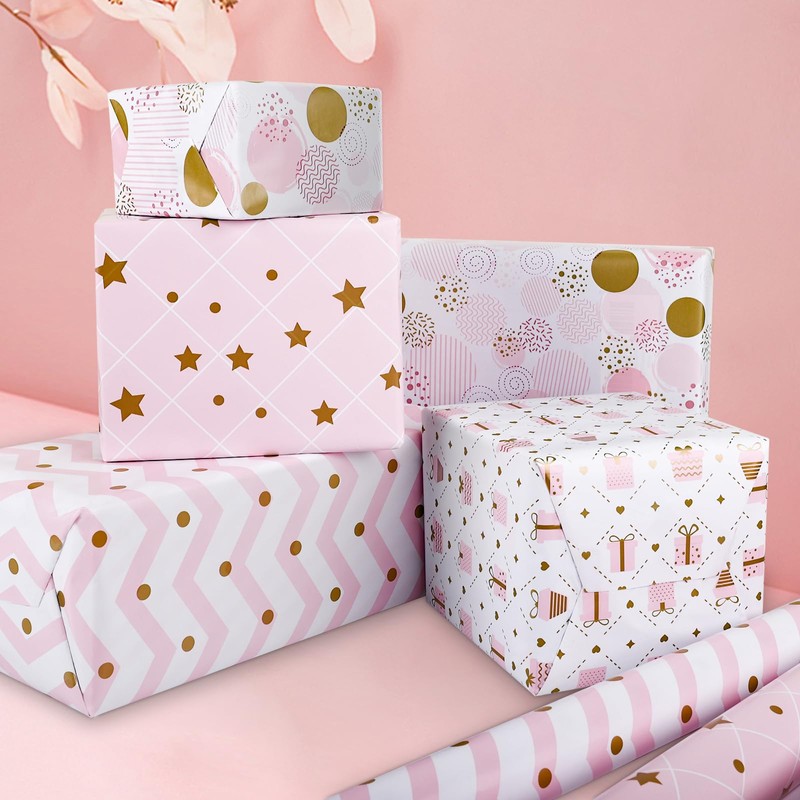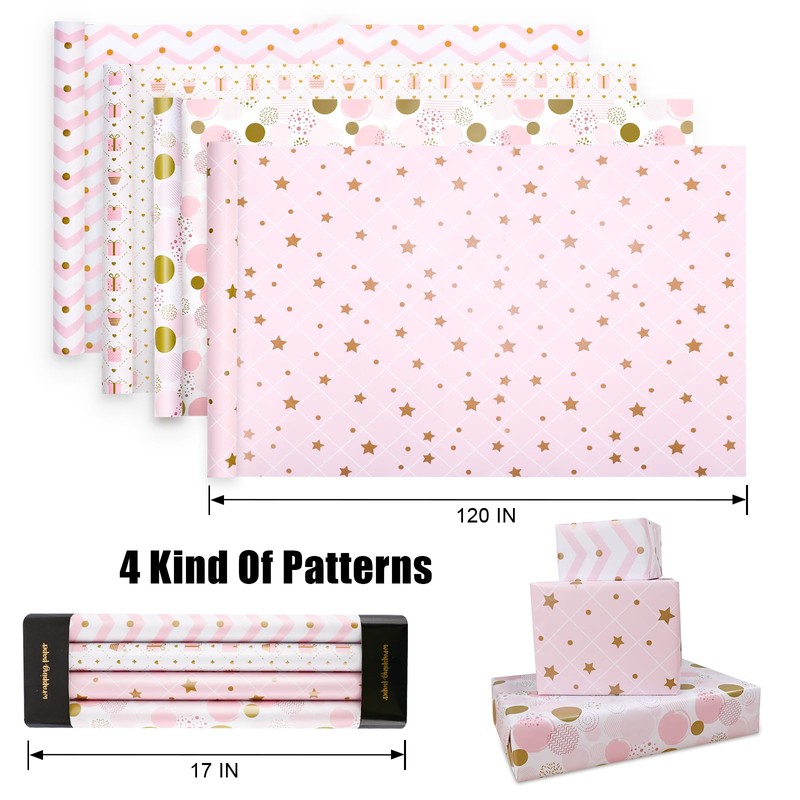 - Eye-Catching Design Wrapping Paper RollIncludes 4 design, Checkered Stars, Checkered Gift Box, Wave Dots, Various Dots.The perfect combination of pink and gold makes your gift look more charming.