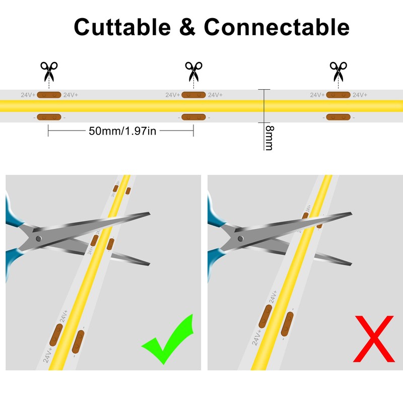 - 5. Easy to install and cut: The FUIQI COB LED strip comes with adapter, controller and 3M adhesive tape on the back, which makes installation easy and flexible. The COB LED flex band can be cut every 5 cm, so you can adjust it to the desired length. Whether as a COB LED strip in the cabinet or as a COB LED light strip in the kitchen - this lighting solution is versatile and user-friendly. If you have any questions, our customer service is available