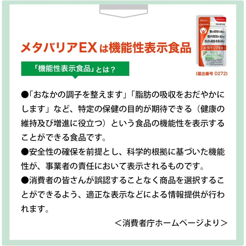 - [Functional Food Notification Number: D272, Consumer Affairs Agency] ■ Notification Product Name: Metabarrier EXa ■ Notification Statement: This product contains salacinol, indigestible dextrin (dietary fiber), epigallocatechin gallate, and monoglucosyl rutin. Suitable for individuals with a high BMI. ■ With continued intake, this product can improve high BMI by reducing abdominal fat (body fat and visceral fat) and weight in individuals with a high BMI. ■ Salacinol has been reported to suppress the absorption of sugars ingested from food and, with continued intake, to improve the intestinal environment (increasing bifidobacteria in the intestine).