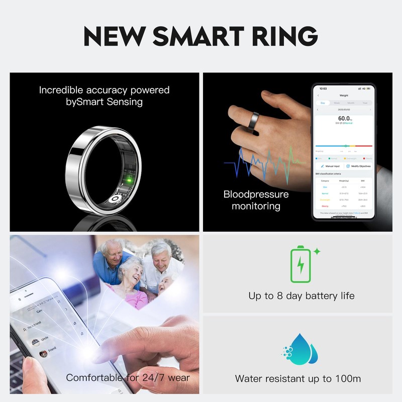 FUJINGHUAN Smart Ring for Women Men – Fitness Health Tracker with Sleep Tracker/Heart Rate/Blood Oxygen/Step Counter/Remote Photography,IP68 Waterproof,Charging case,No Subscription(Silver-8)