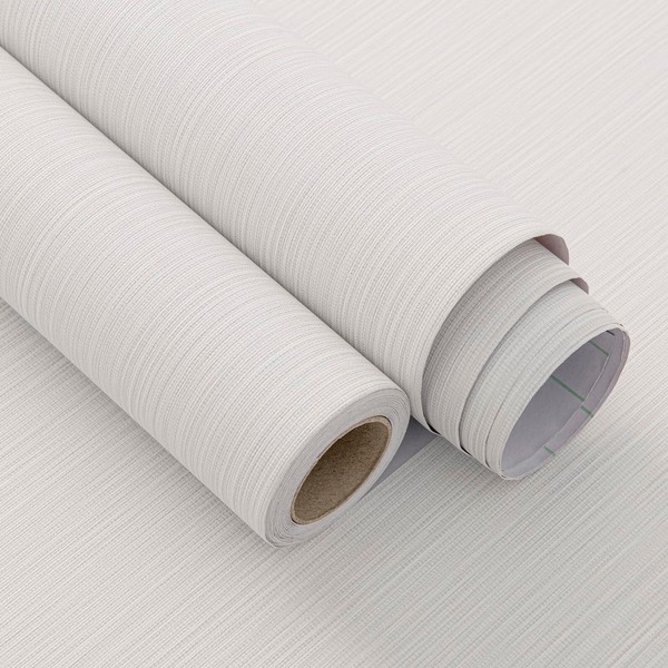 FUKU MON Grasscloth Fabric Wallpaper 24" X 394" White Gray Textured Thick Linen Classic Neutral Grassweave Contact Paper for Walls Cabinets Bedroom Counter Top Liners Fireplace
