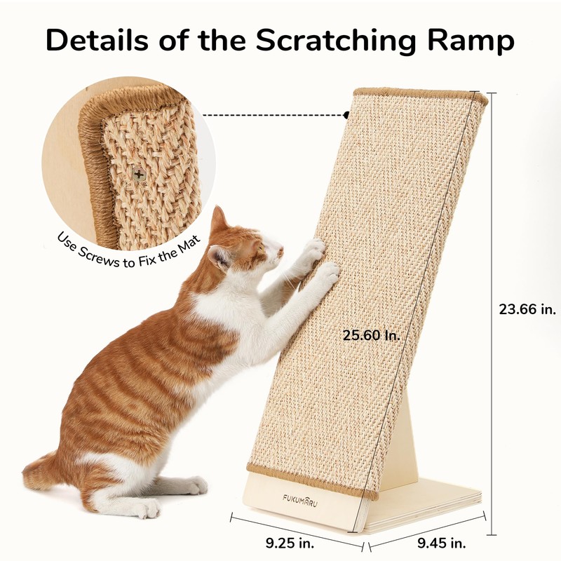 - Product Specifications: The size of the scratching mat is 23.6"L x 15.7"W, the same size of FUKUMARU cat scratching mat 004, replaceable and interchangeable. The size of the whole scratching post ramp: 9.25"L x 9.45"W x 23.66"H.