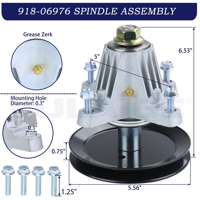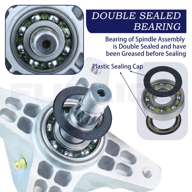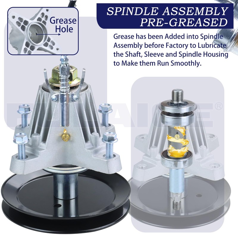 - The Spindle Assembly has been pre-greased prior to leaving the factory. This grease will effectively lubricate the Shaft, Sleeve, and Spindle, ensuring reliable performance for daily applications. Such lubrication guarantees smooth operation and prolongs the lifespan of the spindle assembly; Package Include: 1x918-06976A Spindle Assembly+ 1x 756-05034A Pulley+ 1x Assembly Tool Kit