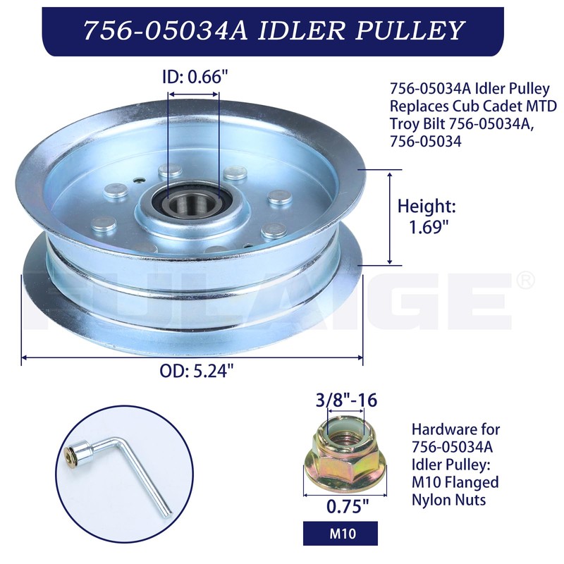 - Idler Pulley Replaces Troy Bilt Idler Pulley 756-05034A, Cub Cadet 756-05034 Idler Pulley Rxt, 756 05034A, 756 05034; Hardware for Idler Pulley: M10 Flanged Nylon Nuts