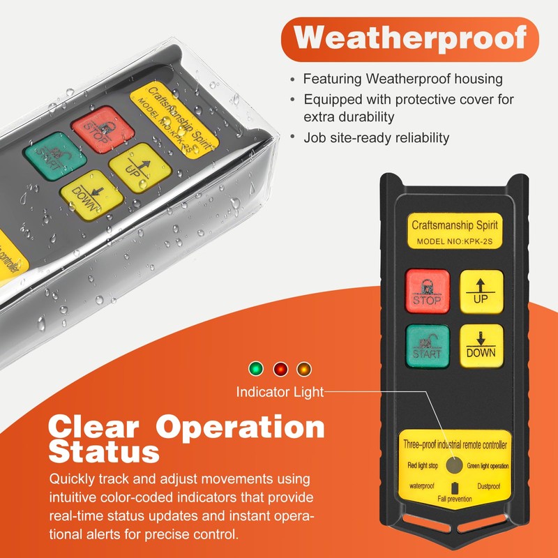 - Weatherproof Remote with Visual Status Indicators: Color-coded indicators clearly display battery level, signal and operation mode in real time. The rugged weatherproof housing withstands rain, dust and tough job site conditions, with included protective cover and lanyard for added durability