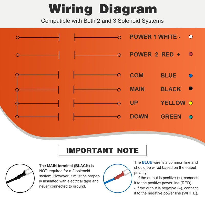 - Works with 2-Solenoid and 3-Solenoid Systems: Whether your equipment has pump motor or not, this remote provides full compatibility. Features straightforward wiring: 6 clearly labeled cables for positive, negative (reversible for different applications), pump solenoid, common terminal, raise, and lower functions