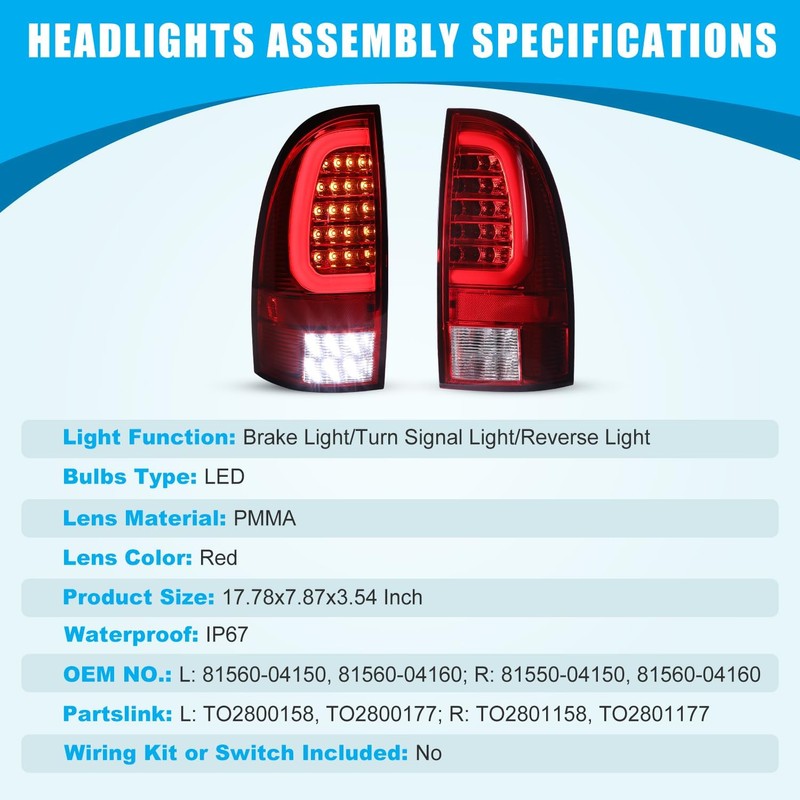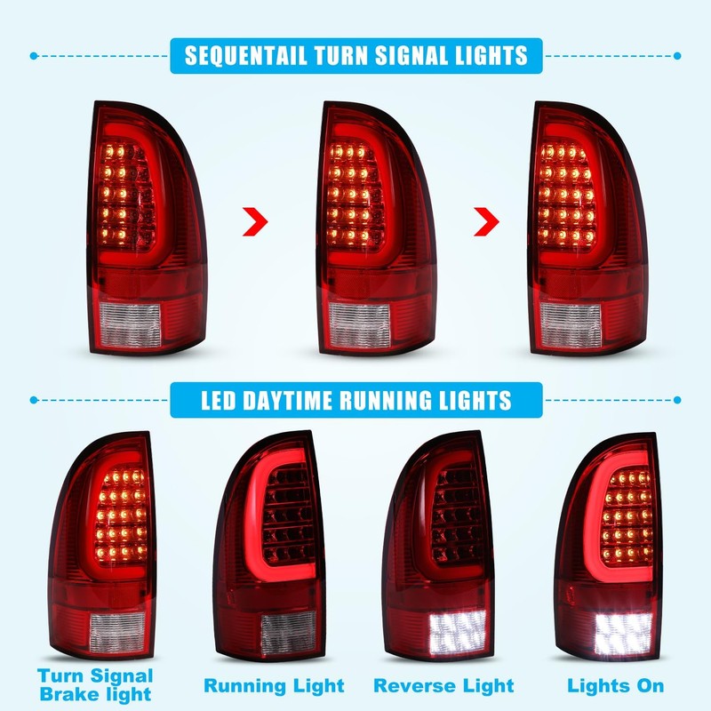 - 【Vehicle Compatibility】Tail lights fit for Toyota Tacoma 2005 2006 2007 2008 2009 2010 2011 2012 2013 2014 2015. Package comes with Driver side and Passenger side taillight. Please make sure your vehicle in our match list before purchased.