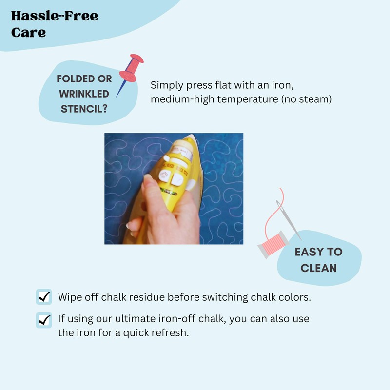 - EASY MAINTENANCE - Easy to clean using a damp cloth or dry microfiber towel for virtually unlimited uses. You can also iron the stencil with a warm iron to clean the chalk dust off if using the Ultimate Quilt Pounce Pad.