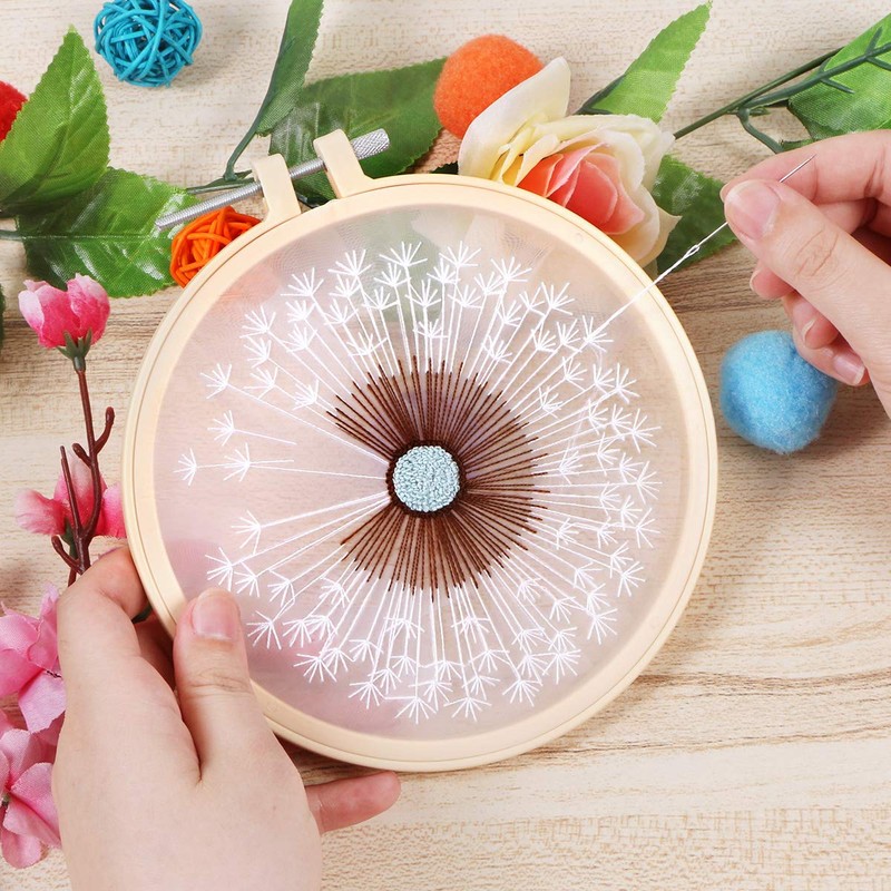 Full Range of Embroidery Starter Kit with Pattern, Kissbuty Cross Stitch Kit Including Clear Organza Stamped Embroidery Fabric with Pattern,Plastic Embroidery Hoop,Color Threads, Tools(Dandelion)