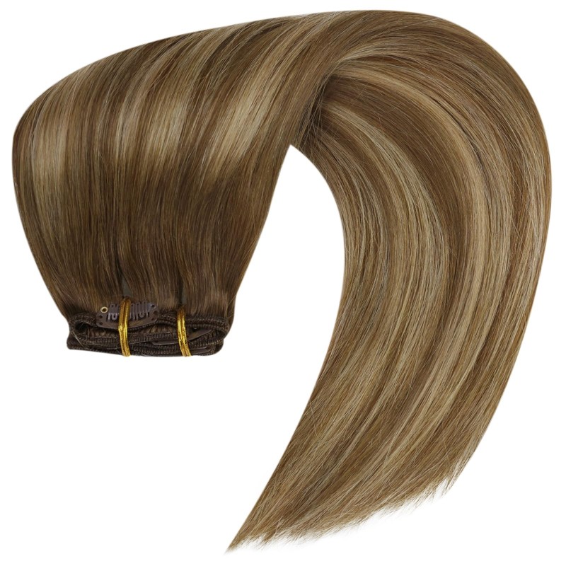 Full Shine Real Hair Extensions Human Hair 7 Pieces Clip in Extensions Balayage Medium Brown and Caramel Blonde Hair Extensions Clip in Double Weft Remy Hair Extensions 16 Inch 105G