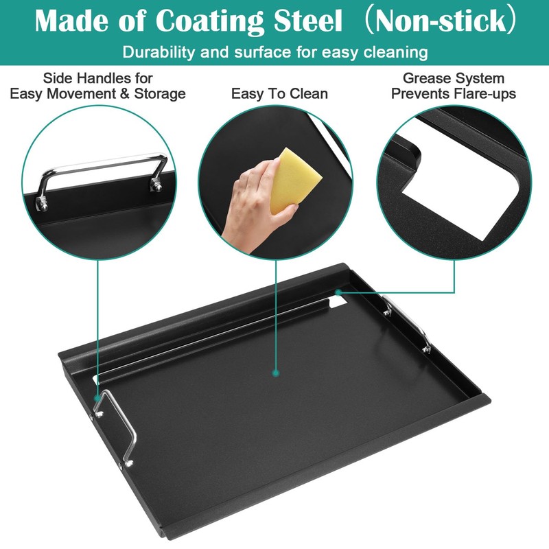 - 【Features】The inserts griddle is closer to the fire source and heats up more easily than other griddles placed on the grates to achieve the temperature needed to cook delicious food. Before use, please remove the grate & emitter plates to achieve closer to the heat source. The surface of the baking pan is made of coating, durable and easy to clean, need to be heated and oiled 1-2 times before use for better results.