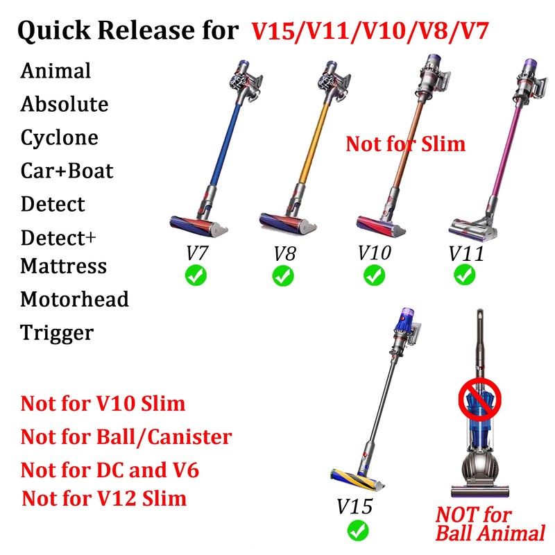 - Fullclean motor head is made to compatible with most handheld Dyson V15 V12 V11 V8 V7 V10 Vacuum Cleaner;compatible with V15 V12 V11 V8 V7 V10 Animal,Absolute,Cyclone,Fluffy,Motorhead,Total Clean,Car+Boat,Trigger,Detect.NOT for V10 SLIM and ANIMAL 2,NOT for any ball/canister/upright/DC/V6 series.
