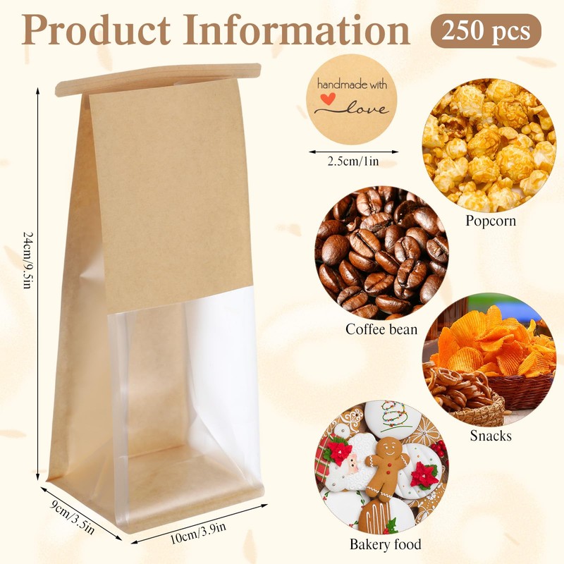 Fullhawl 250 pcs Bakery Bags with Window, 3.9 x 3.5 x 9.5 Inch Small Tin Tie Tab Lock Cookie Packaging sourdough Bag Kraft Paper Bag Resealable Packaging Storage Bags for Homemade Bread Cookies