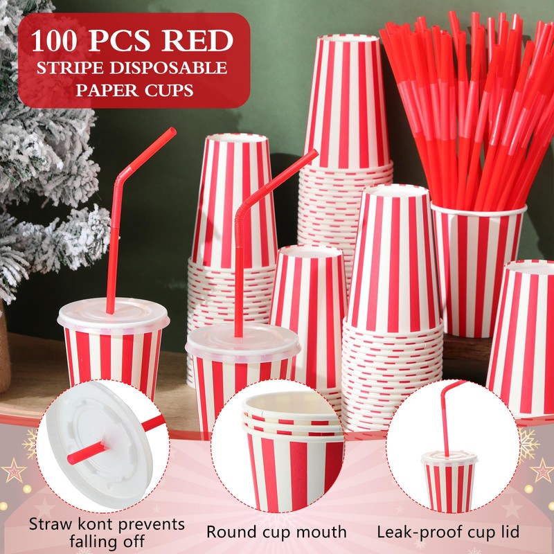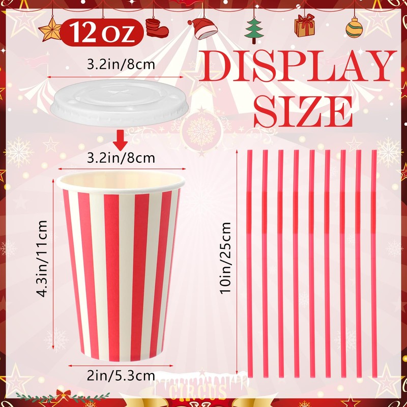 Fullhawl 50 Set Red Stripe Disposable Paper Cups with Lids and Straws for Christmas Carnival Party 12oz Disposable Drinking Striped Paper Cups Holiday Birthday Circus Supplies for Coffee Tea Juice