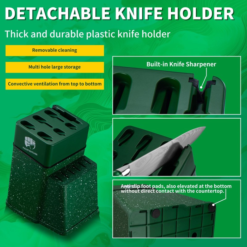 - Kitchen Knife Set Includes:1 Knife Block Holder, 8" Chef Knife, 8" Slicer Knife, 8" Bread Knife, 7" Nakiri Knife, 6" boning Knife, 3.5" Paring Knife, 6pcs Steak Knives, 1 kitchen Scissors. Whether cooking at home or outdoors, it can meet your needs. The knife holder is a thickened plastic knife block, sturdy and durable, washable for easy cleaning. It a perfect gift for special occasions such as housewarmings, birthdays, and holidays.