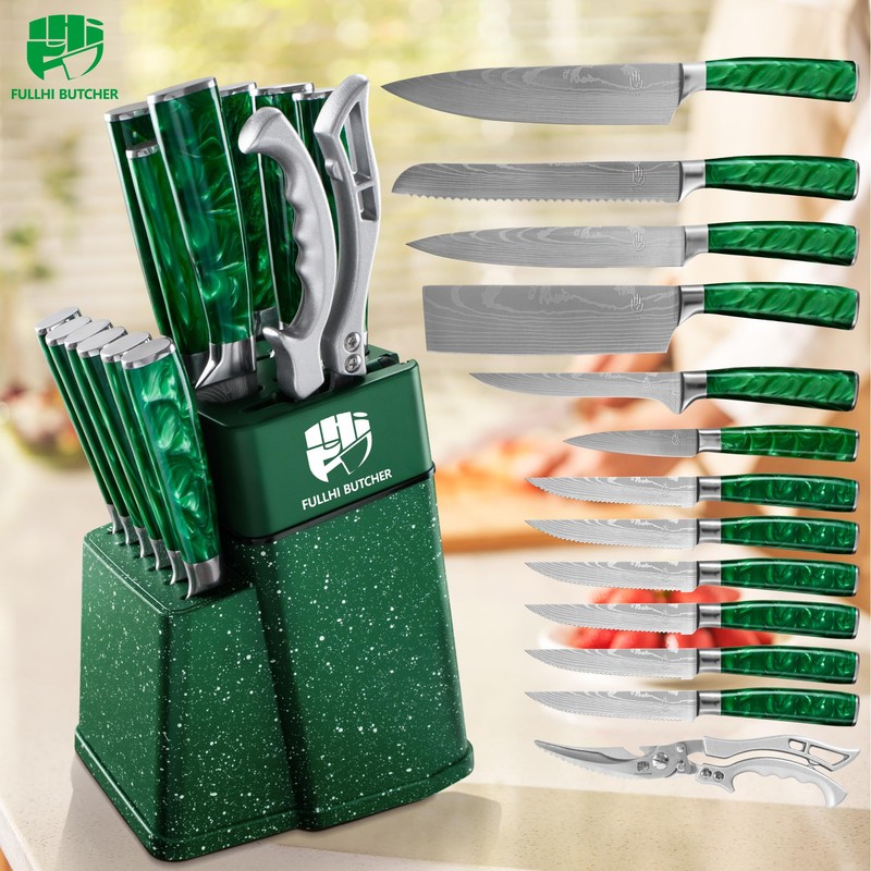 FULLHI 14pcs Block Knife Set, Chef's Knife Steak Knives Set with Block and Sharpener, Kitchen Knife Set, Multi-colour Handle, Gifts for Men Women