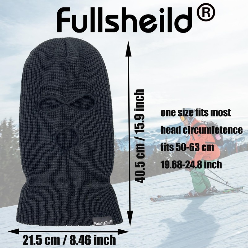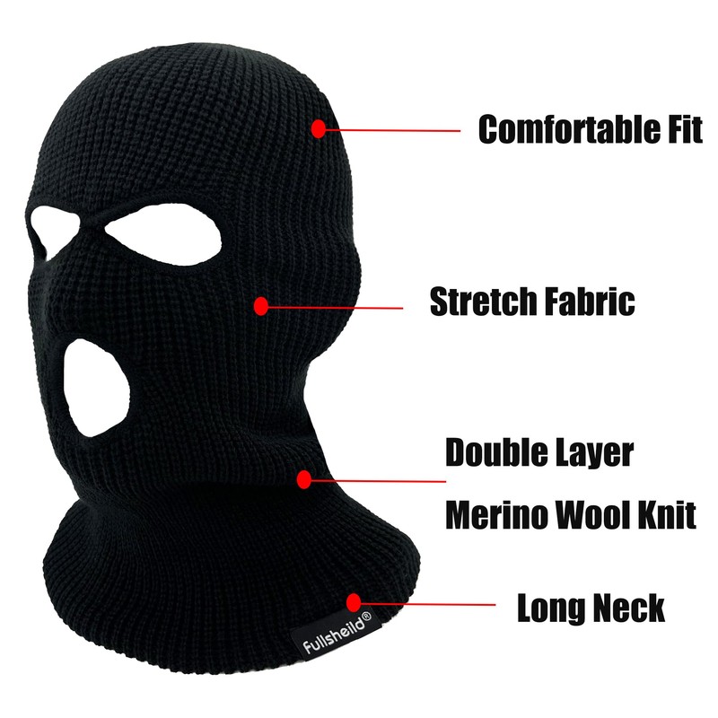 Fullsheild 3 Hole Merino Wool Balaclava Face Ski Mask Winter Knitted Full Face Cover Black One Size