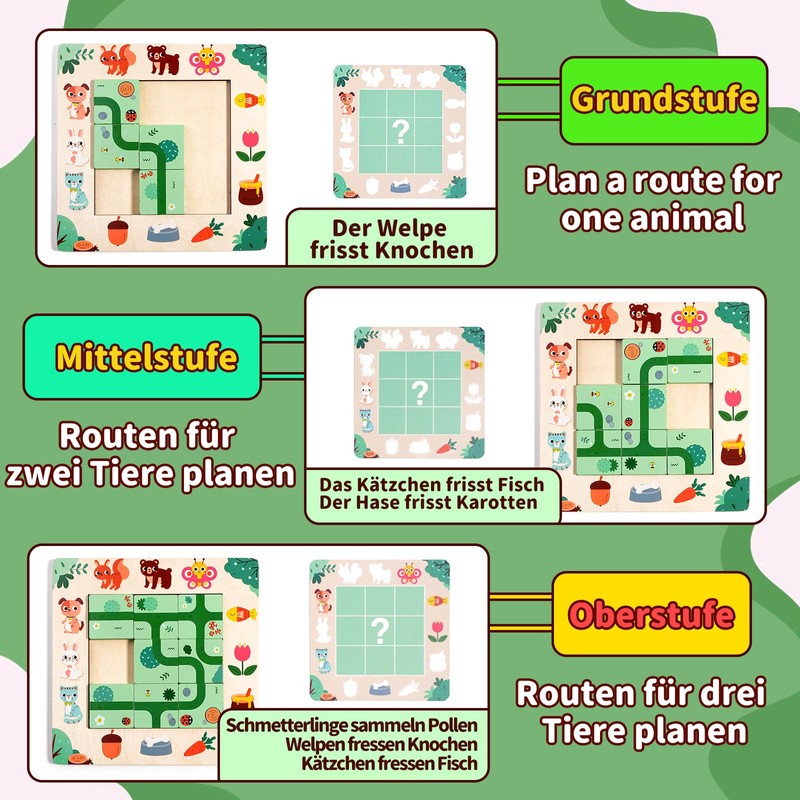 • Find the food for different animals: This is a street puzzle game for children. Based on the challenge cards, guide the animals on a path to their appropriate food to successfully master the challenge! The Montessori toys contain 40 challenge cards that require flexible thinking from children. It is perfect for great thinking skills and an ideal labyrinth gift for children 3-10 years.