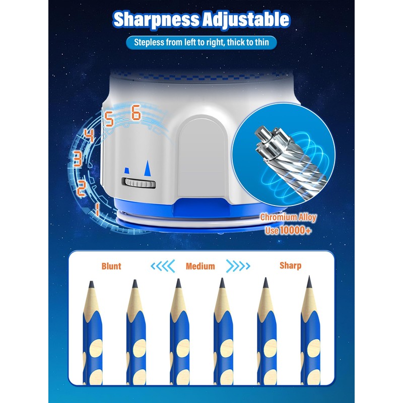 - Designed for 7-12 mm pencils: automatic electric pencil sharpener can be adjusted to 7-12 mm pencils, different types of pencils can be sharpened: round shafts, hole shafts, triangular shafts, hexagonal shafts and drawing colouring pencils. Note: Not suitable for soft pen refills.