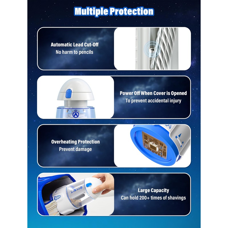 - Auto-stop and safety design: when the pencil sharpens, the best sharpness will automatically stop and pop-up, will not hurt the pen; electric pencil sharpener will overheat protection and open the cover power protection, greater protection of the machine to use safety, and has a transparent large capacity waste chip compartment, according to the capacity of timely cleaning, with the matching small brushes for cleaning.