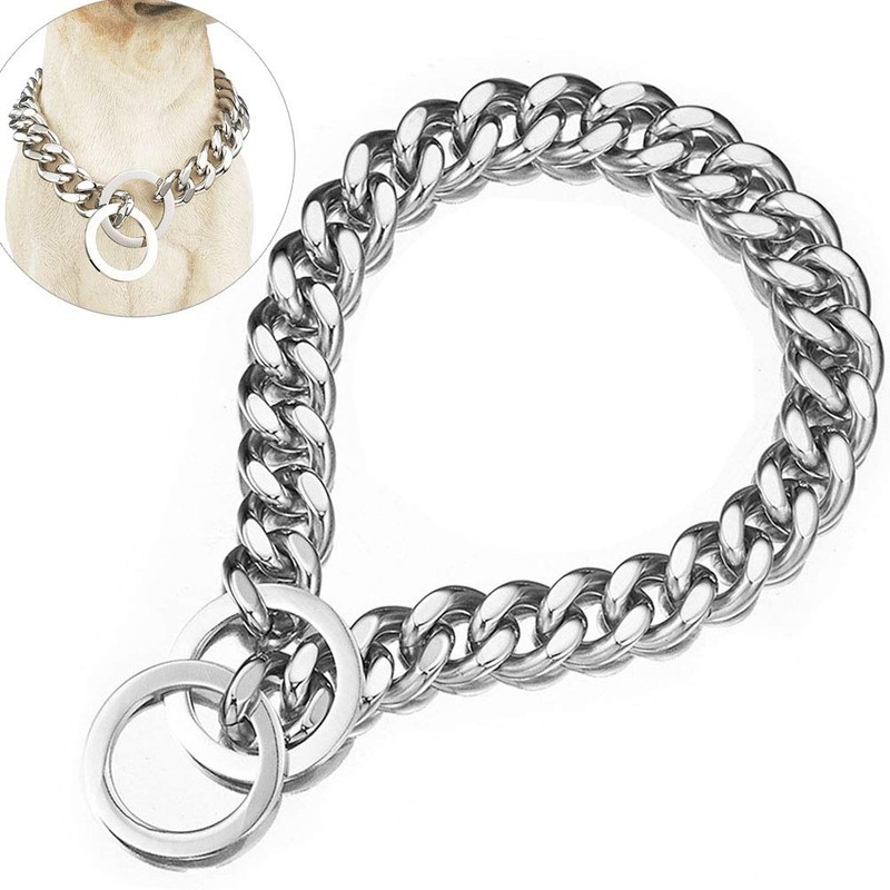 Fully Welded Steel Dog Collar,Length16-26inch,Heavy Duty Choke Cuban Dog Chain for Large Dogs,Strong Stainless Steel Links Slip Chain Training Collar (Wide:15mm-Silver)