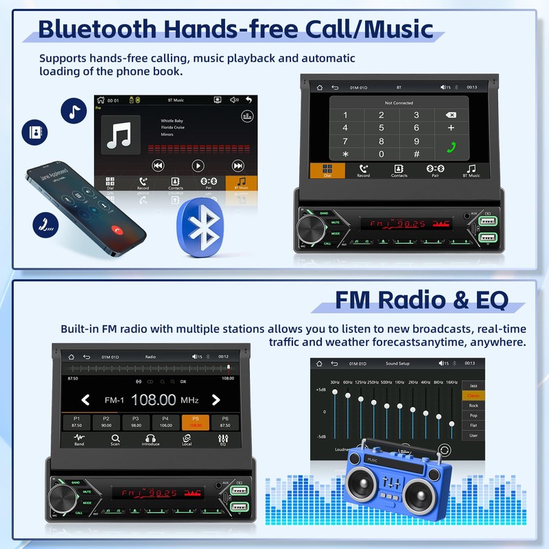 • 【Hands-free Bluetooth & FM Radio】Bluetooth single din car stereo with hands-free Bluetooth makes it easier to make or receive important calls. Wireless Bluetooth music playback lets you enjoy your favorite songs by simply pairing it with your smartphone. Built-in FM radio with multiple stations allows you to listen to new broadcasts, real-time traffic and weather forecasts anytime, anywhere