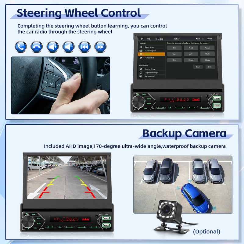 • 【1024*600 HD Retractable/Flip OutTouch Screen】Manual Retractable screen offers flexibility in adjusting the display for optimal viewing angles or when it's not in use. The 1024*600 LCD touch screen operates sensitively and brings better visual experience.The physical buttons, especially the rotary volume control, make it easier to operate the device while driving.