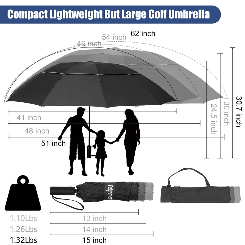 - Travel Umbrella Compact: Fulynmen large umbrella can be folded only 14 inches to pack inside the car, travel bag, or daily backpack but provides a 54 inch arc huge double canopy which is like a golf windproof large umbrellas for rain 2 people or more. No matter what Mother Nature says, the umbrella is holding up.