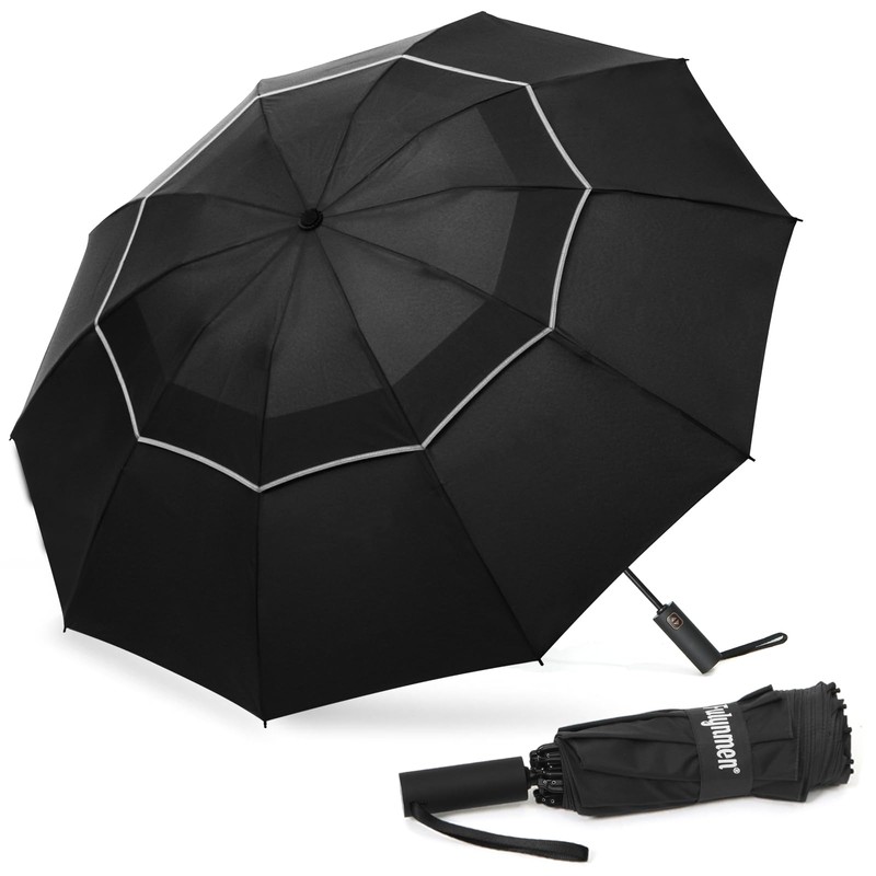 Fulynmen 54 Inch Large Travel Compact Umbrella Windproof Golf Umbrella Big Inverted Umbrellas for Rain with 10 Ribs Double Canopy Vented Automatic Open Close Reflective Stripe Black