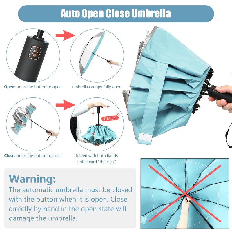 - ⚙️Auto Open & Close: Automatically open and close with one press of a button on the ergonomic umbrella handles in a second, giving you the ability to quickly & easily open or close your umbrella, one hand operation and provides great convenience to open or close it when you hold a lot of bulky items or get in/out of the car.