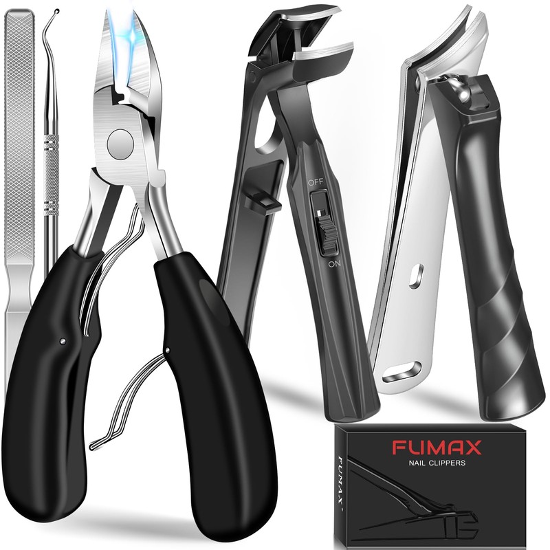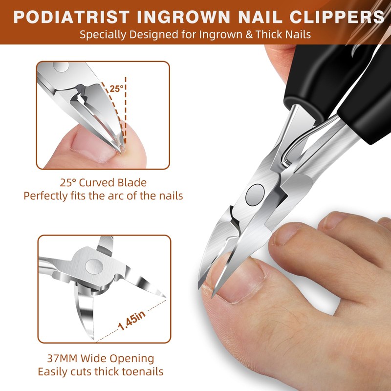 - Large Podiatrist Toenail Clippers - Toenail clippers for men feature 25-degree curved blades that perfectly conform to the shape of the nail and reach deep into nail grooves. Thick toenail clippers can open the cutting mouth up to 37mm to trim even the thickest toenails with ease. Upgraded ABS non-slip handle is ergonomically designed for a firm and comfortable grip. And double springs on the handle also extend the life of toenail clipper.