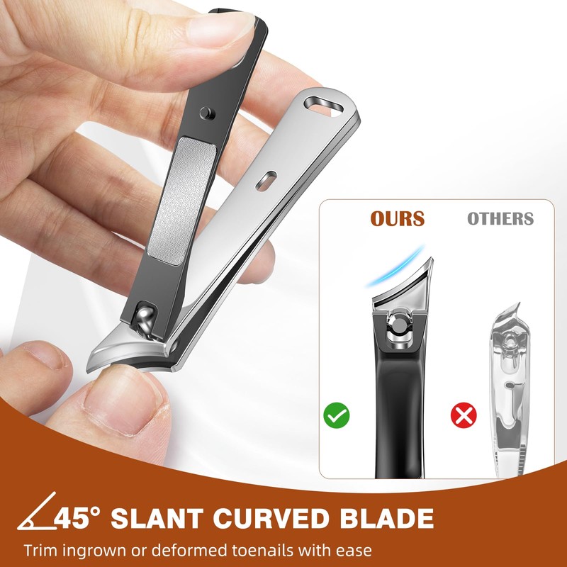 - Upgraded 45 Slanted Nail Clippers - New slanted nail clippers are larger, with a wider opening and sharper blades. The 45-degree curved blades fit the shape of the nails perfectly for precise trimming of ingrown toenails, sharp corners, cuticles and peeling skin. The extended widened blades reach deeper into the nail groove to easily trim hard-to-reach areas, perfect for thick and side nails.
