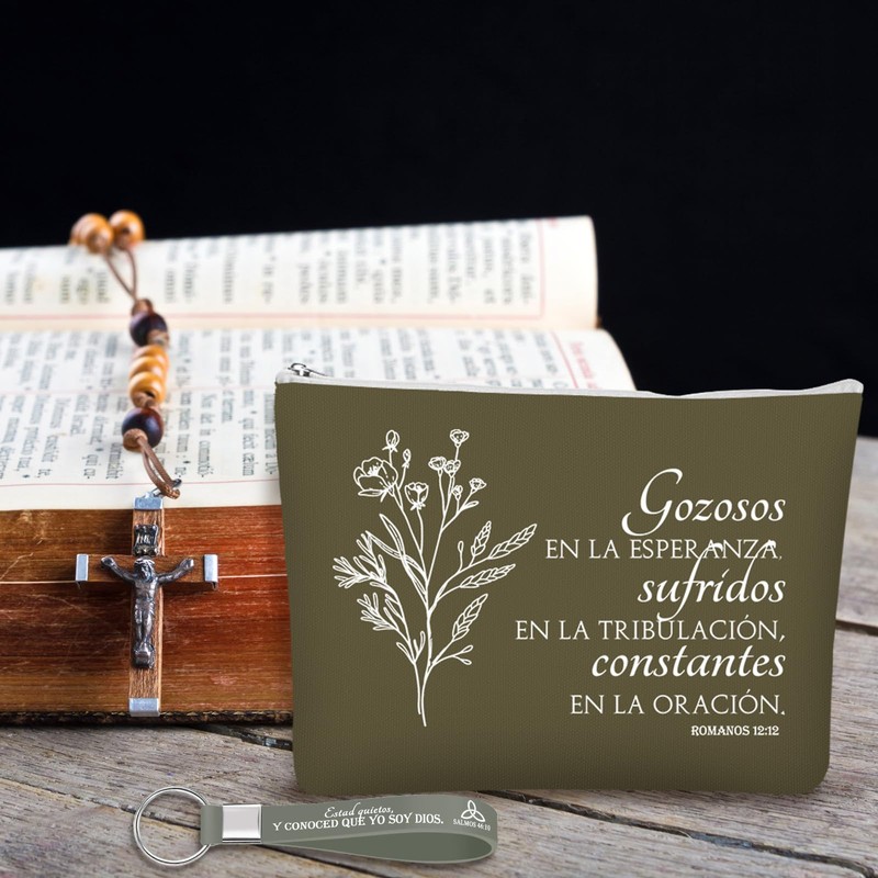 - Spanish Bible Verse Designs: our religious silicone keychain and canvas makeup bags are printed with 10 different inspirational bible verses on surfaces, which will build your faith and self confidence and positively impact people lives who are sad or in need, to inspire them to live a cheerful life