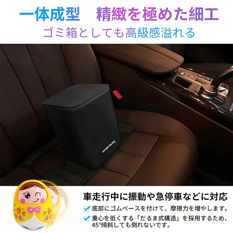 - [Tapered Bulb Structure Resists Tipping Over] When you’re driving, garbage has a tendency to fall over from bumps or sudden stops.This car trash can was developed by our store to take into account the elements of actual use in a car environment.The rubber base on the bottom provides added traction.In addition, the tapered bulb structure lowers its center of gravity so that even if you tilt it 45° it won’t tip over.Safe to use in the car.