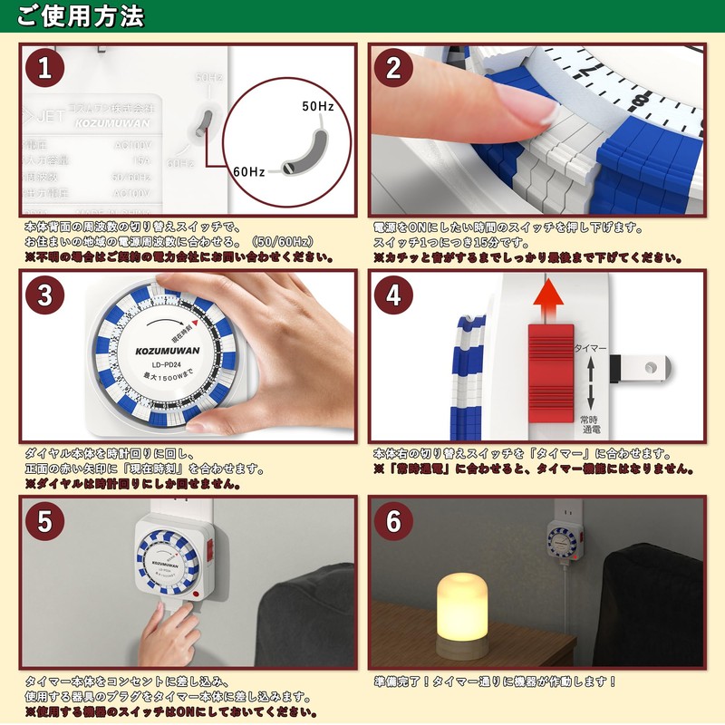 The power switch of electrical appliances can be automatically turned on and off. Set once and repeat every day. Only for AC 100V, up to 1500W. Non-short tracking plug