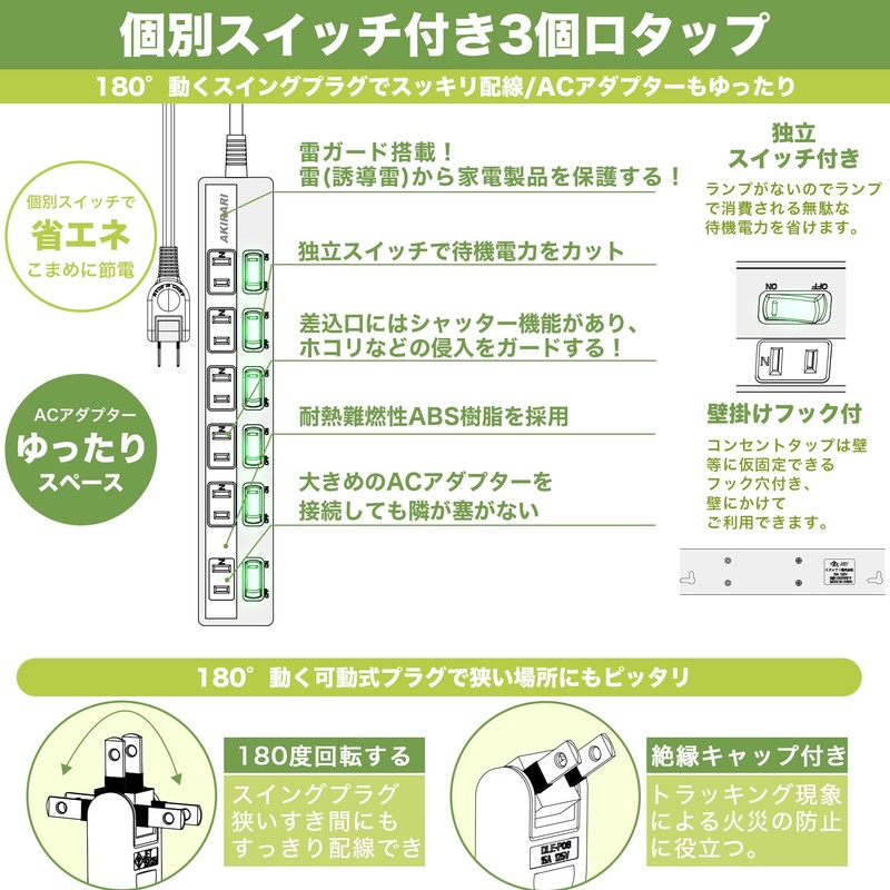 • ★ INDIVIDUAL SWITCH ★ This table tap has a separate switch for each outlet. This allows you to easily turn off your unused device and reduce wasted power. For example, you can turn your device off in bulk before you sleep at night, or just select and turn on the device you use. This will help you save on energy bills and use ecology in mind