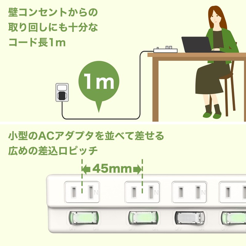 ■ The outlet has a 1.8 inch (45 mm) pitch and can be connected to 6 small AC adapters. It is convenient for you to connect your iPad or other tablet charger.