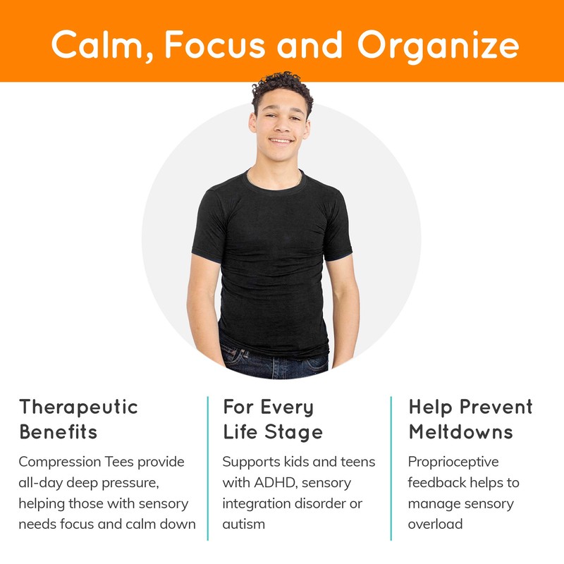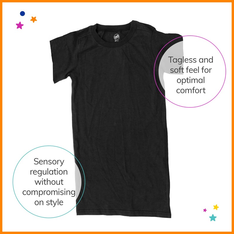 Fun and Function Sens-ational Hip Hugging Black Tee Short Sleeves for Kids and Teens Provides Deep Pressure for Children with Special Needs or Sensory Issues, Medium (Ages 8-9)