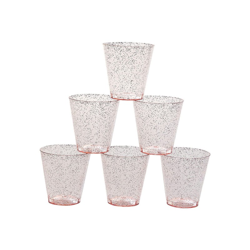 - These shot glasses are infused with pink glitter to class up your party tableware and can be used for wedding receptions, birthday parties and much more! Material: Plastic. (50 pcs./unit) Size: 2" 2 oz.