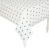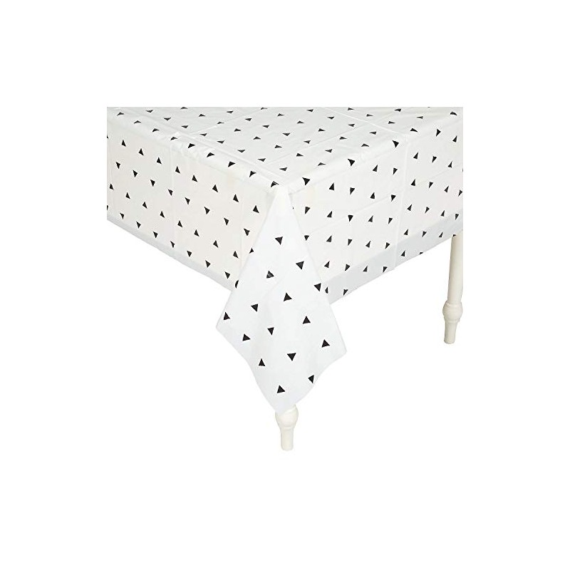 - Keep your tables sitting pretty during your party with this disposable tablecloth. Featuring a white background with small black triangles throughout the tablecloth it can be mixed and matched into any selection of party supplies. Plastic. Thin transparent. Disposable. 54 x 108