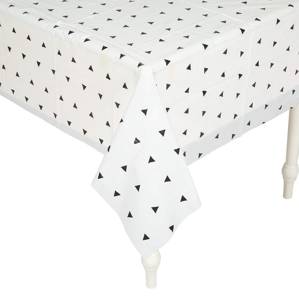 • Keep your tables sitting pretty during your party with this disposable tablecloth. Featuring a white background with small black triangles throughout the tablecloth it can be mixed and matched into any selection of party supplies. Plastic. Thin transparent. Disposable. 54 x 108