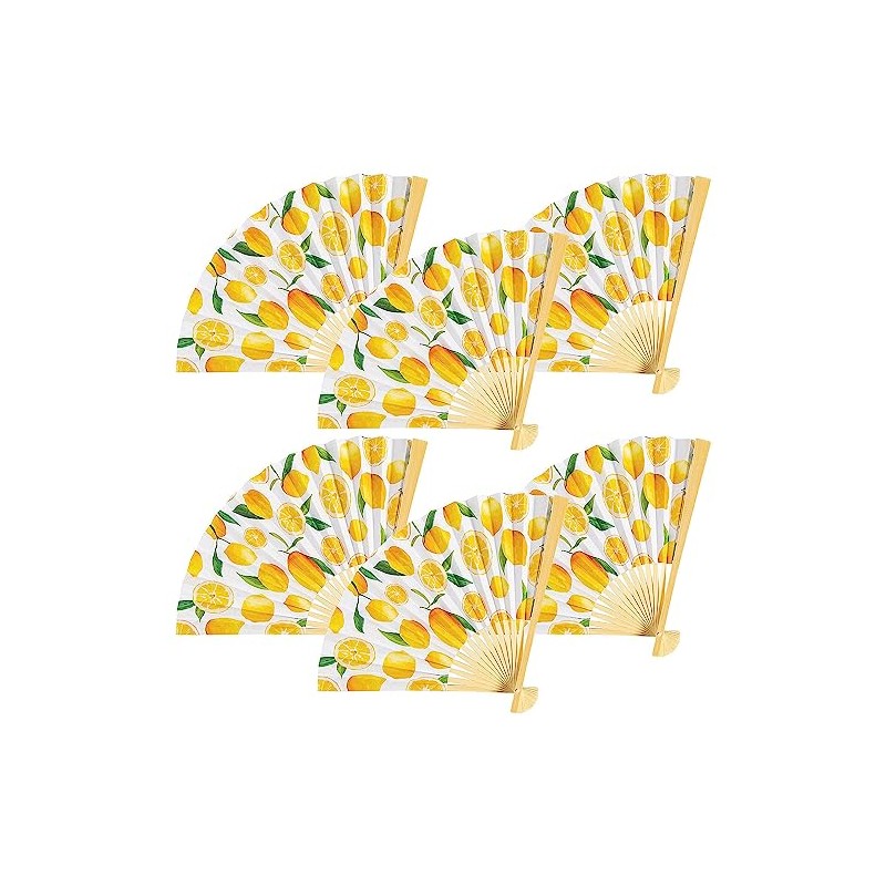 - This specially priced bulk buy is great for party favors or wedding handouts; these folding hand fans come adorned with a lemon design. Material: Paper with a wooden handle. Size: 10" (48 pcs./unit)
