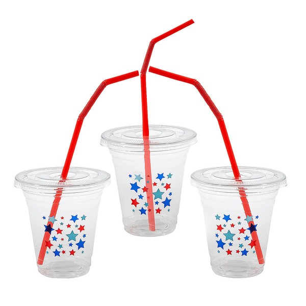 Fun Express Clear Patriotic Plastic Cups with Lids & Straws, 50 Count