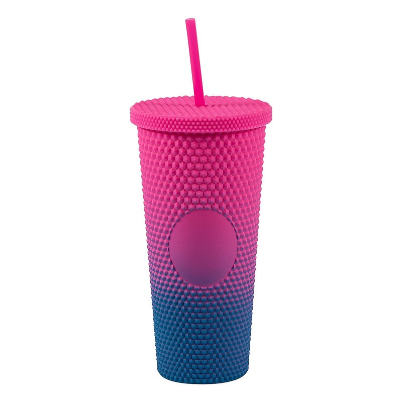 - Looking for a convenient and stylish way to take a drink on the go? Grab this charming pink and blue tumbler so you can sip your drink in style. The plastic travel tumbler also features a lid and straw so drinks will stay in the cup no matter where your to do list takes you. Plastic. 8 1/4" 24 oz.