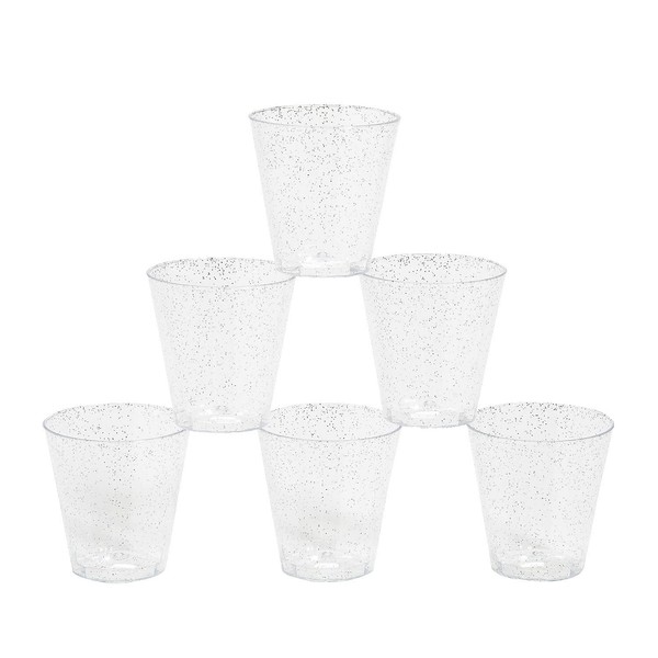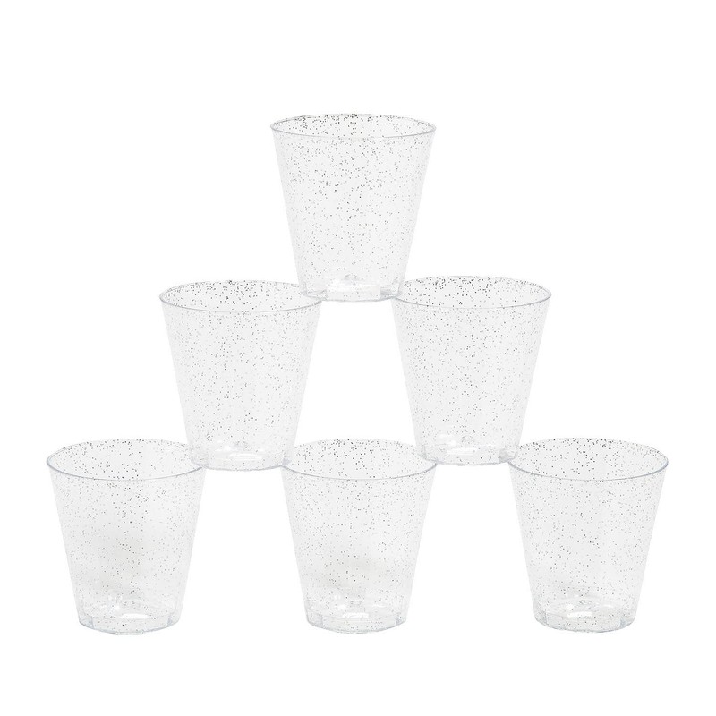 - These shot glasses are infused with silver glitter to class up your party tableware and can be used for wedding receptions, birthday parties and much more! Material: Plastic. (50 pcs./unit) Size: 2" 2 oz.