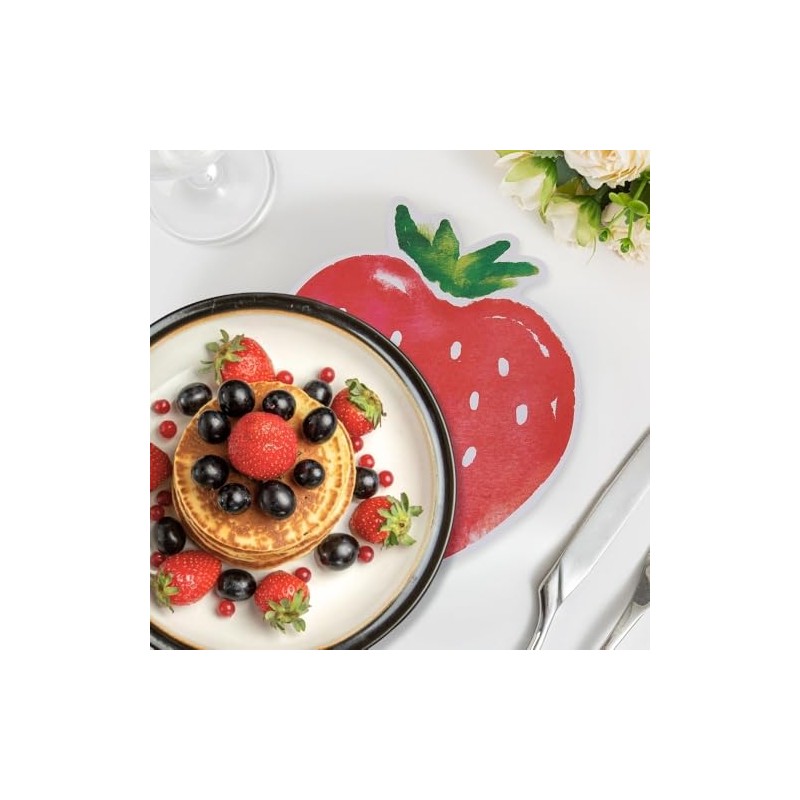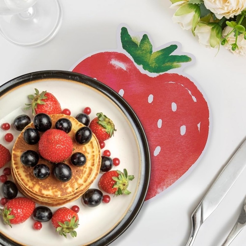 - Your berry-themed party gets a tableware upgrade with these paper placemats. These charming placemats look just like juicy, ripe summer strawberries and make the perfect addition to your disposable tableware for a birthday party, bridal shower or baby shower. Browse our site for more coordinating berry-themed tableware and party decorations. Paper. (20 pcs. per unit) 12 1/2" x 13"