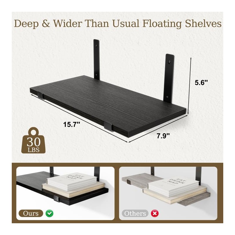 - [8 INCH DEEP FLOATING SHELF] Generous shelf space holds photos, DVD players, videos, books, decor and prized knick-knacks. This wider floating shelf provides ample room to beautifully display your favorite items while keeping your space stylishly organized